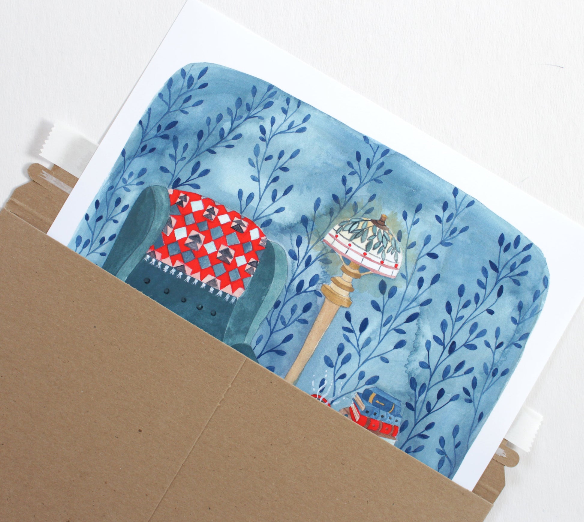 Hello! This is a reproduction print of a watercolor painting that I did of this sweet pup sleeping on the coziest chair, surrounded by books.