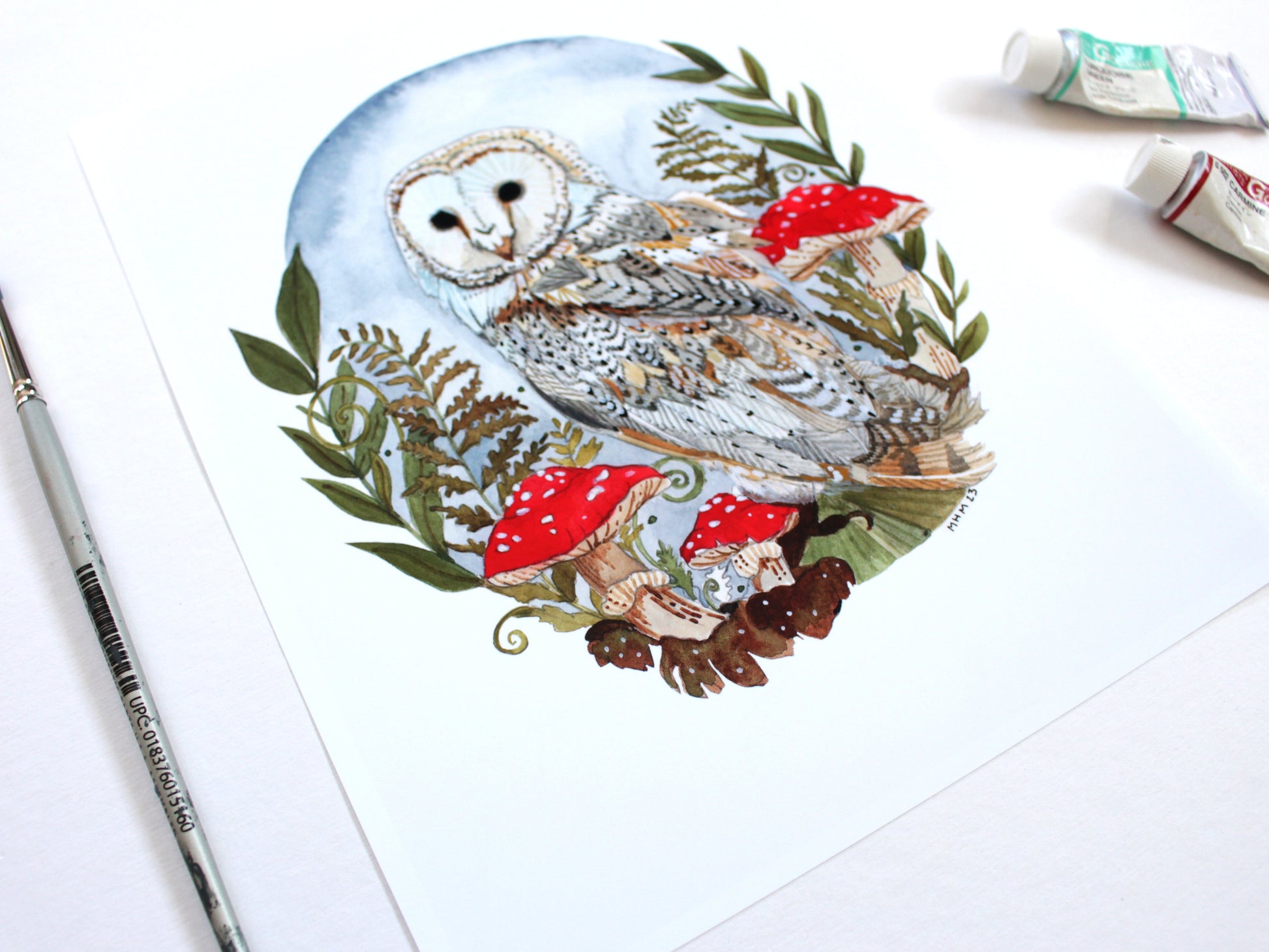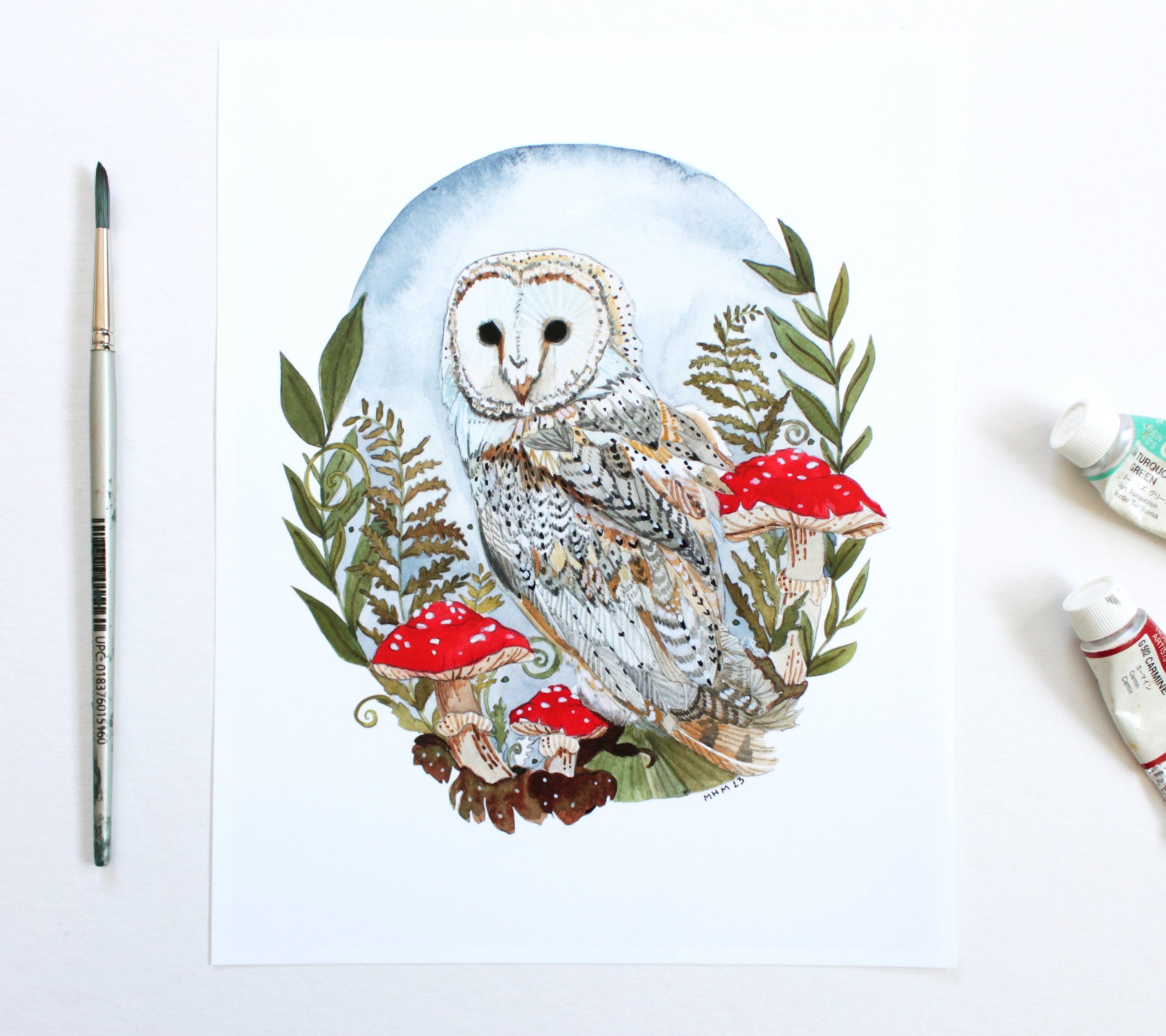 Hello! This is an 8x10" print of an illustration featuring a barn owl amongst some mushrooms.