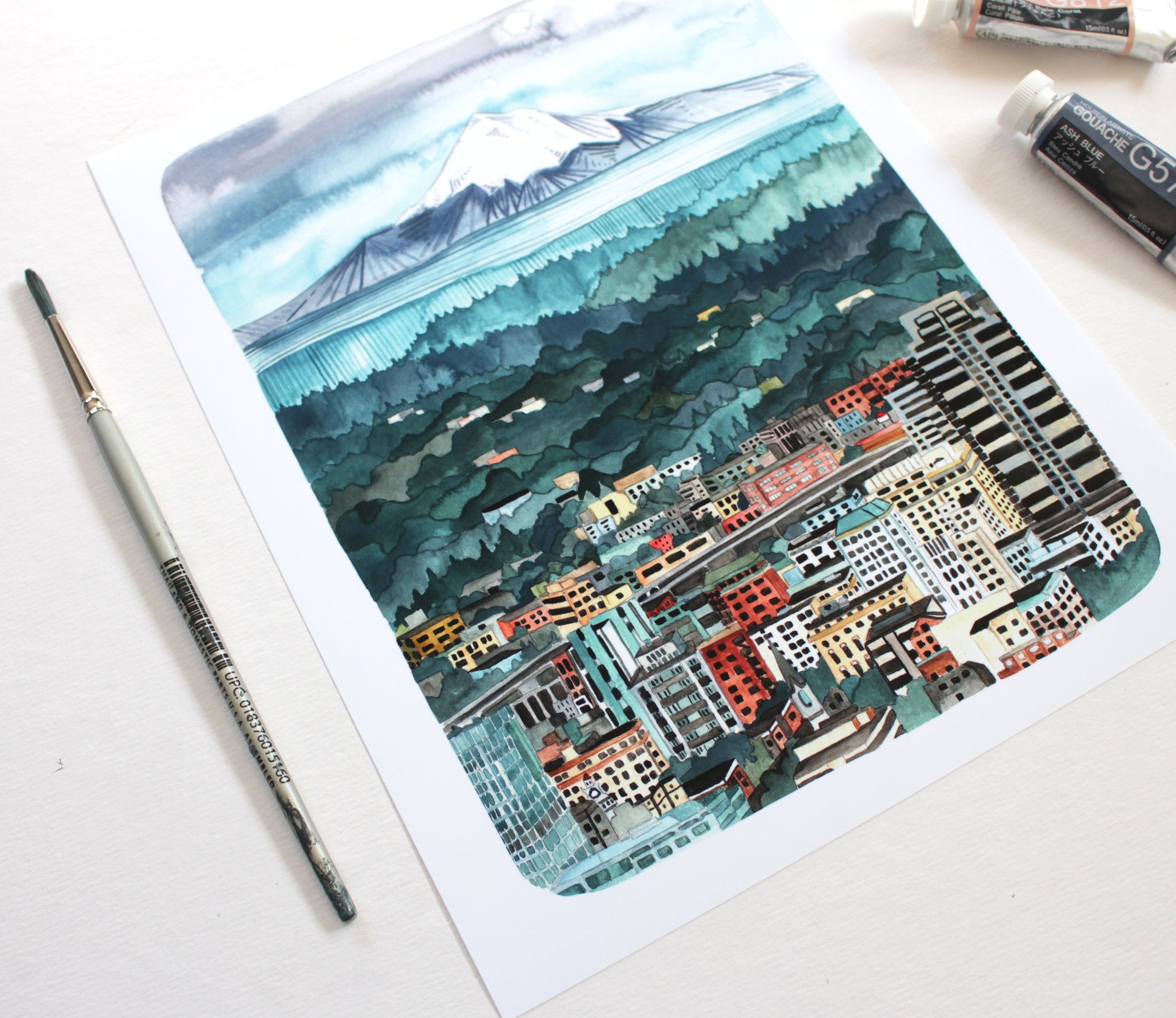 Hello! This is a reproduction print of an original painting that I painted of Mt Hood looking over the city of Portland.