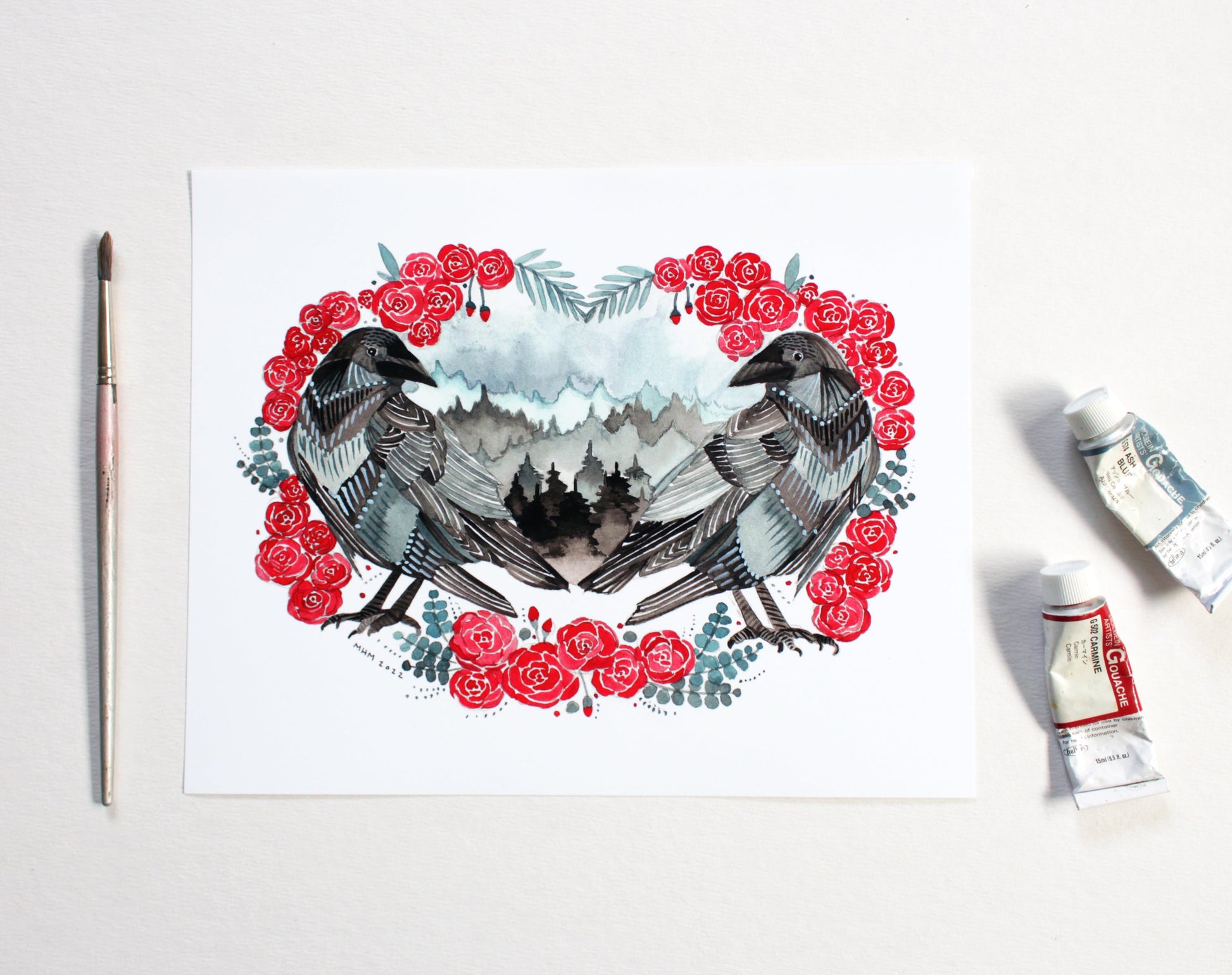 Hello! This is a listing for an 8x10" print of two crows with roses and a forest scene. I painted the original using gouache paint.