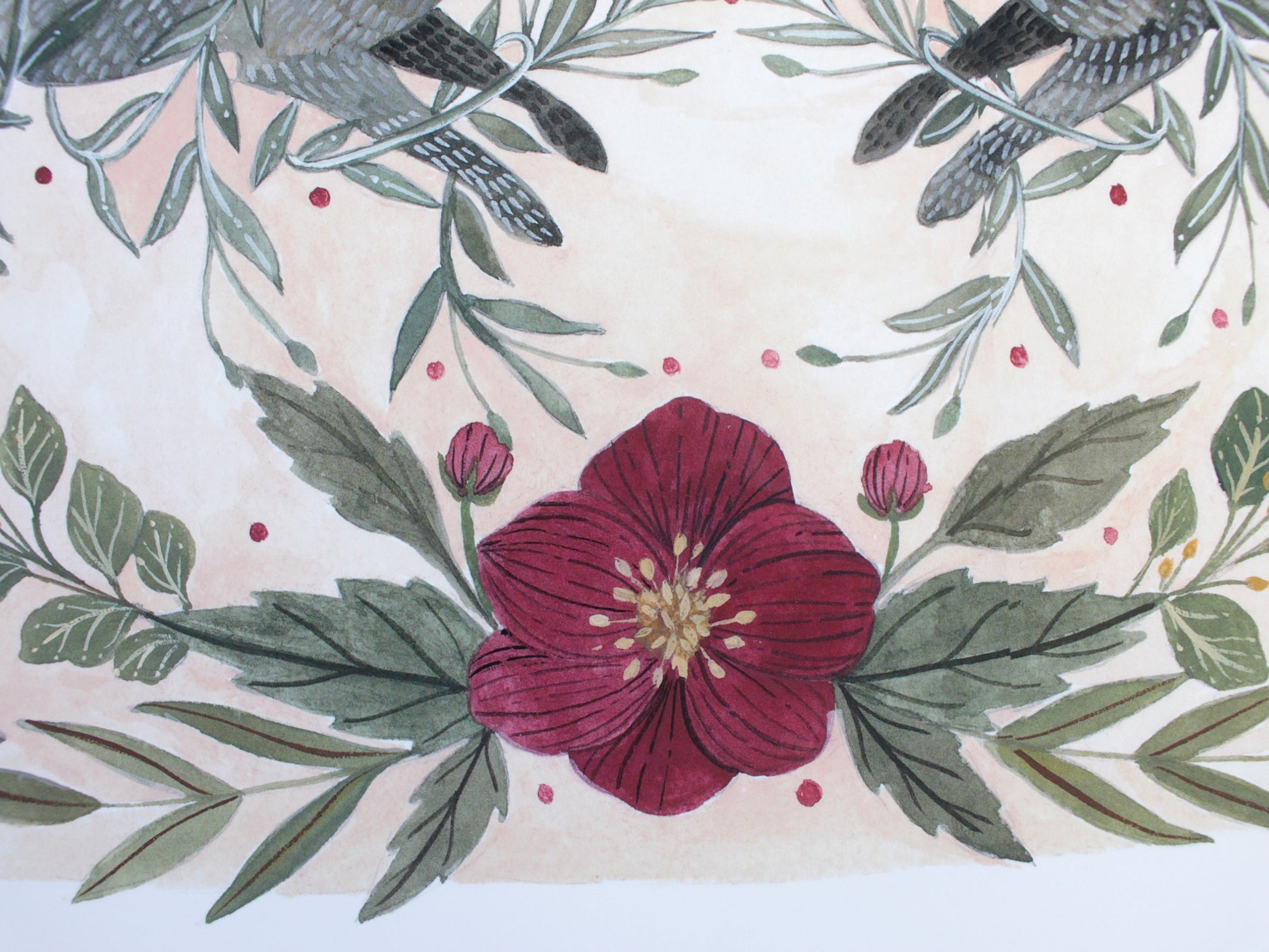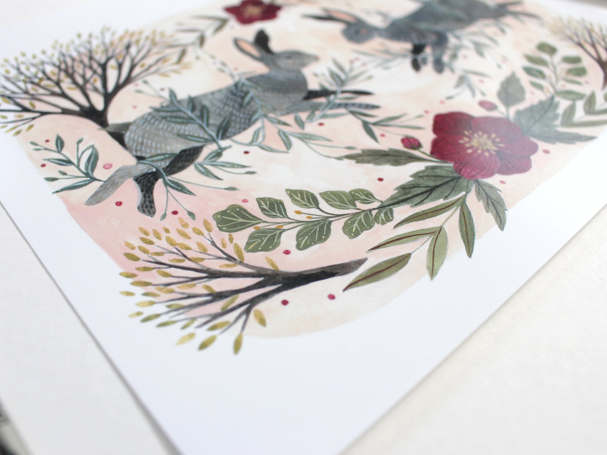 Hello! This is a listing for a reproduction print of an original watercolor painting of two rabbits that are surrounded by trees and floral elements.
