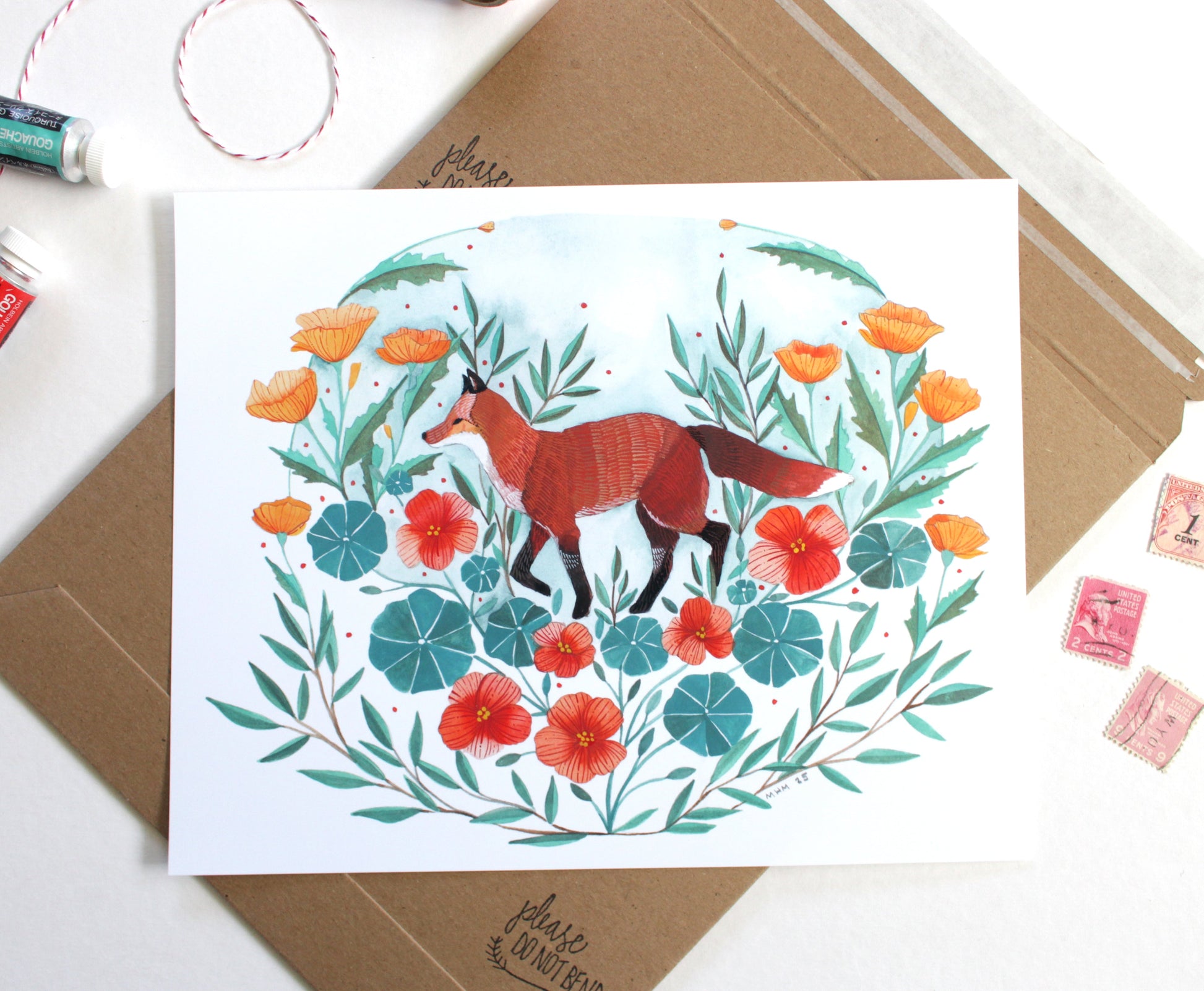 Hello! This is a listing for a reproduction print of an original watercolor painting of a red fox surrounded by nasturtium flowers and California poppies.