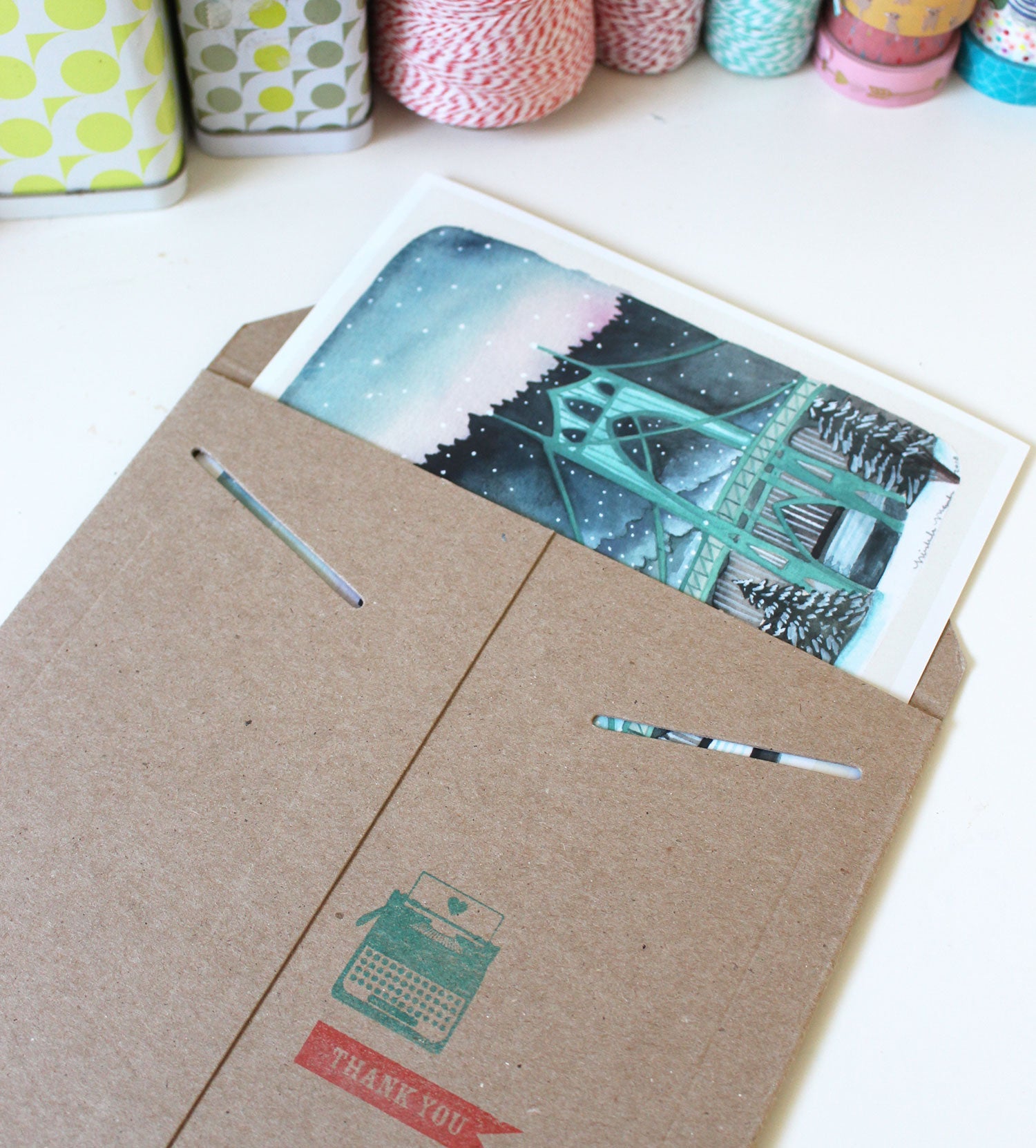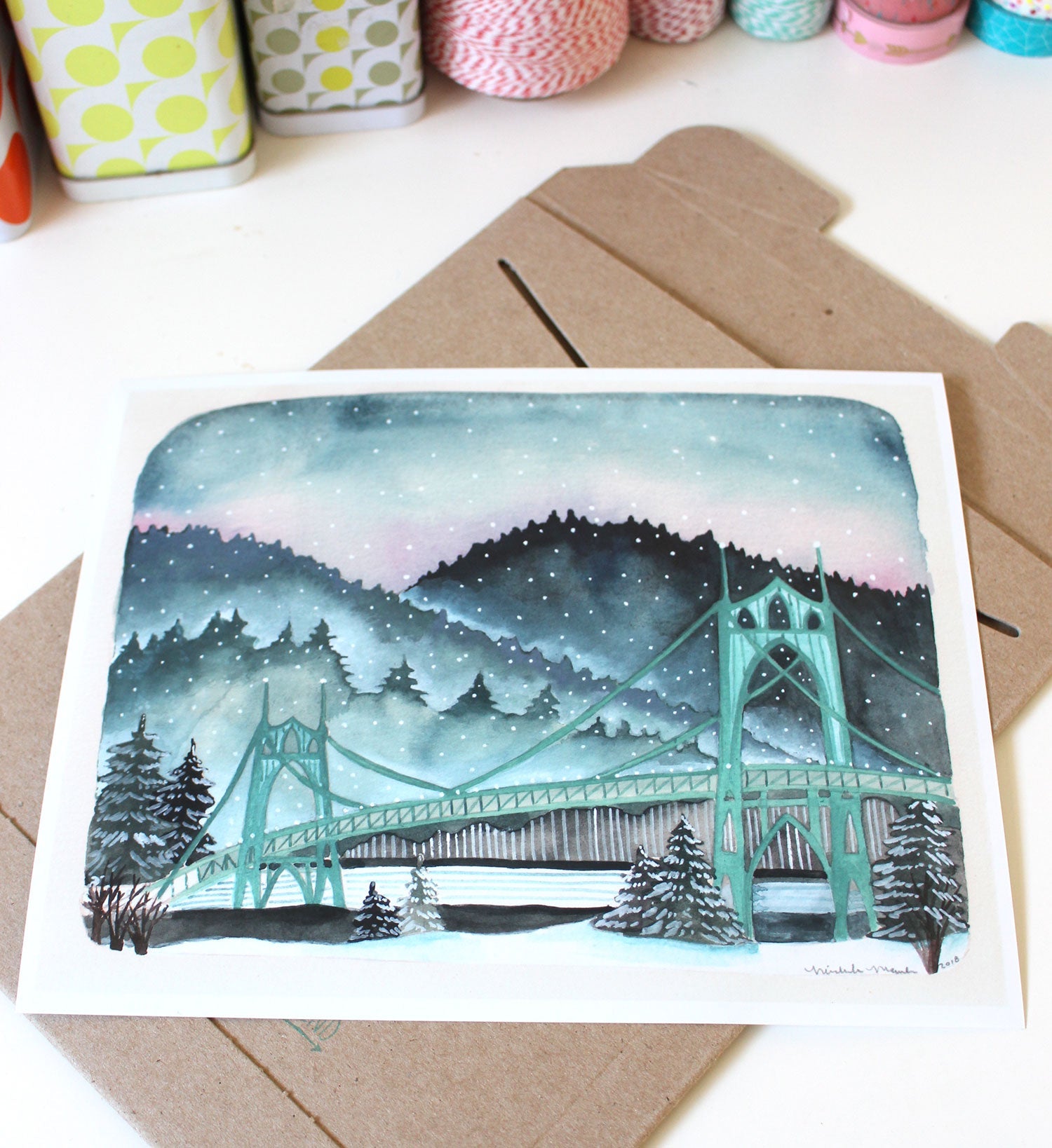 Hello! This is an 8x10" print of an original illustration featuring a Portland's St Johns Bridge during a rare snow storm.