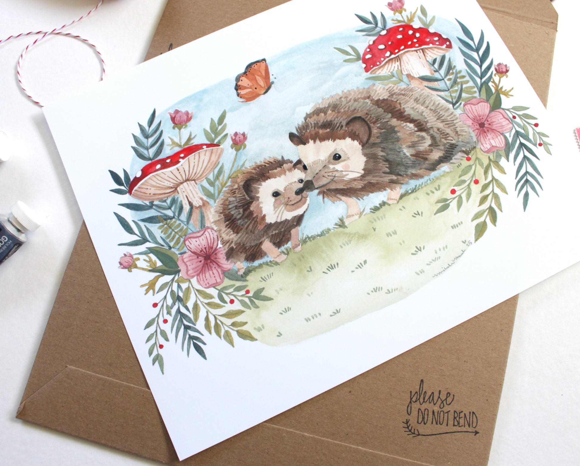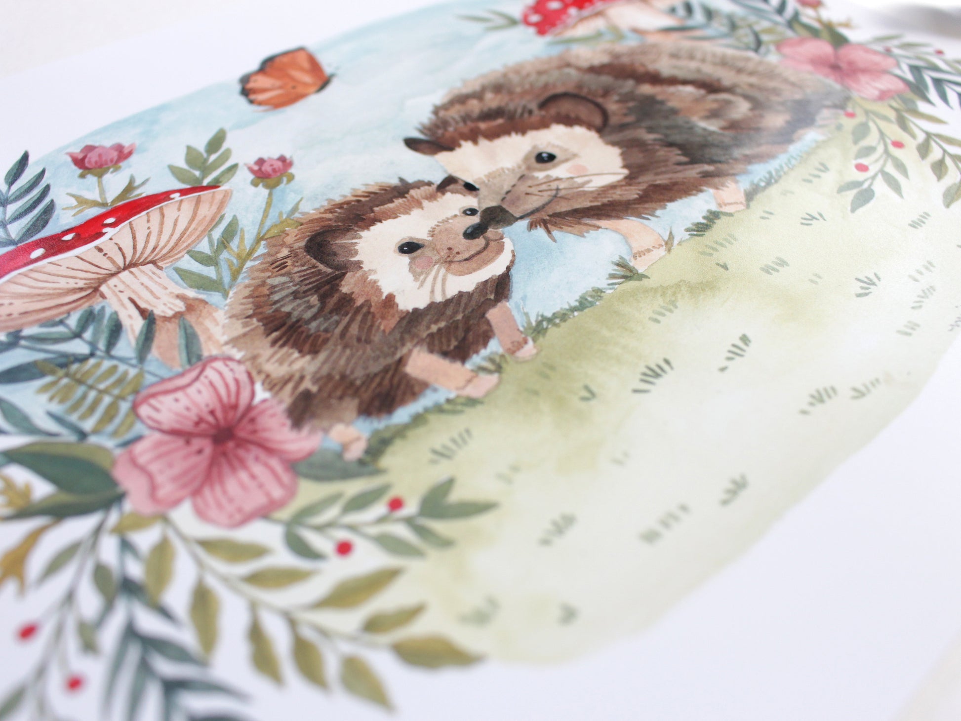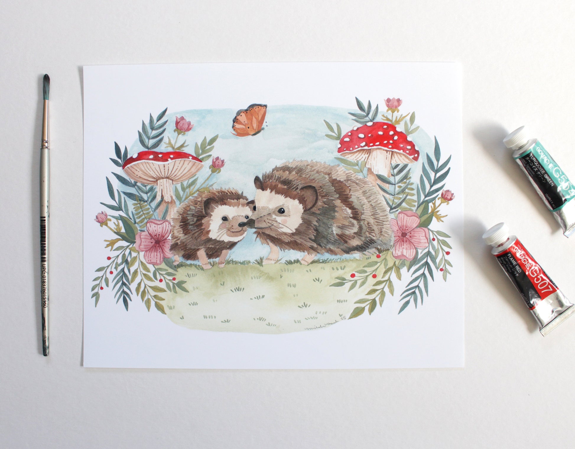 Hello! This is a listing for a reproduction print of an original watercolor painting of two little hedgehogs cuddling with each other. I originally painted this to be a Mother's Day card, but I thought it would make a great print for a kid's room, or nursery.