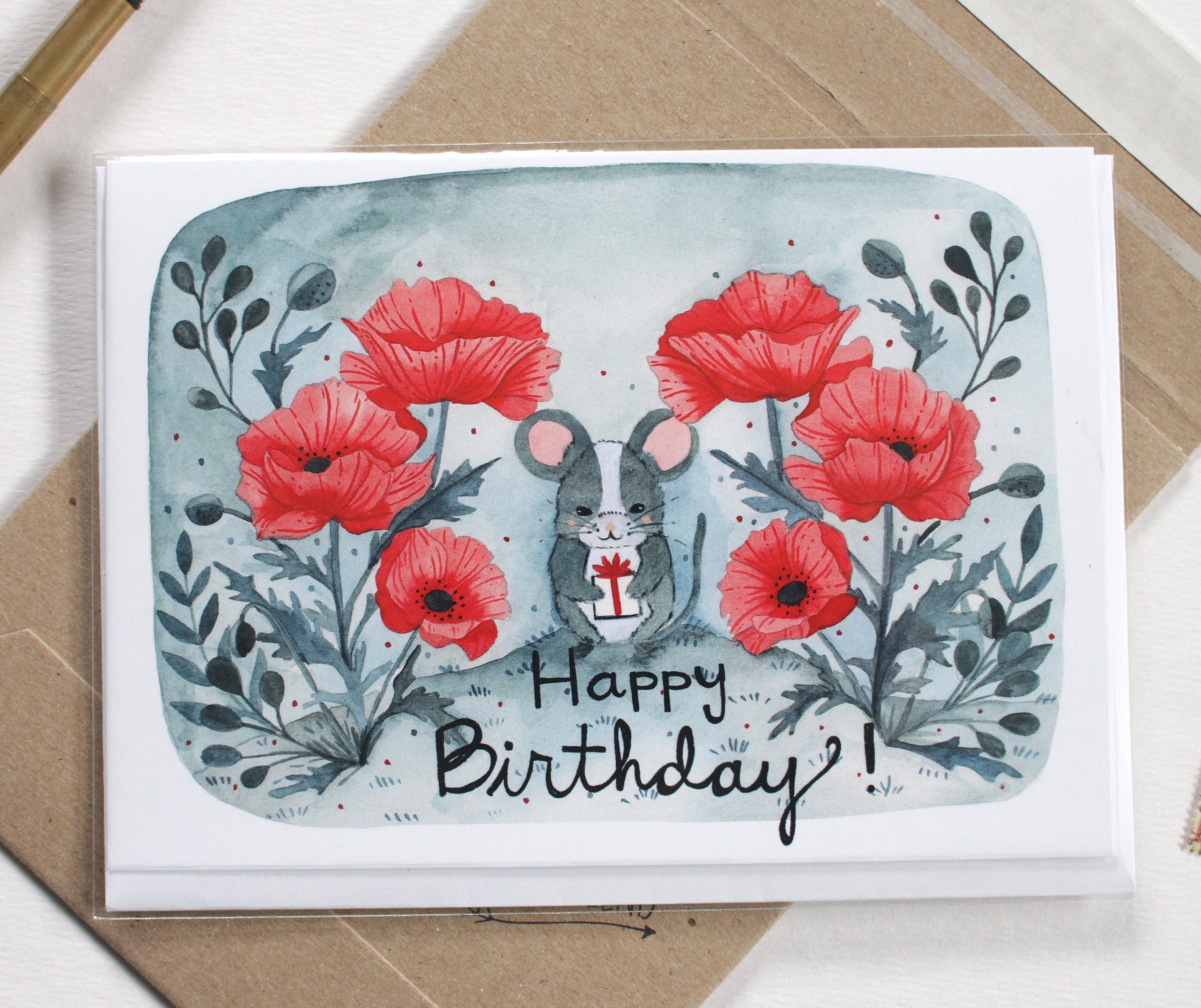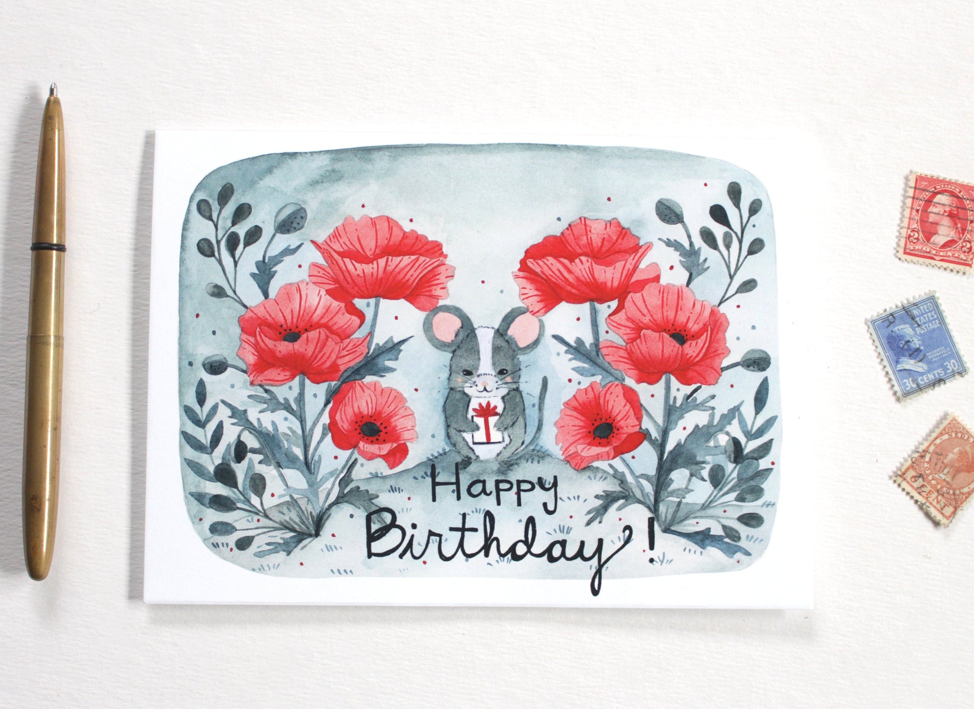 Hello! This is a listing for a birthday card featuring a sweet little field mouse handing out a gift.