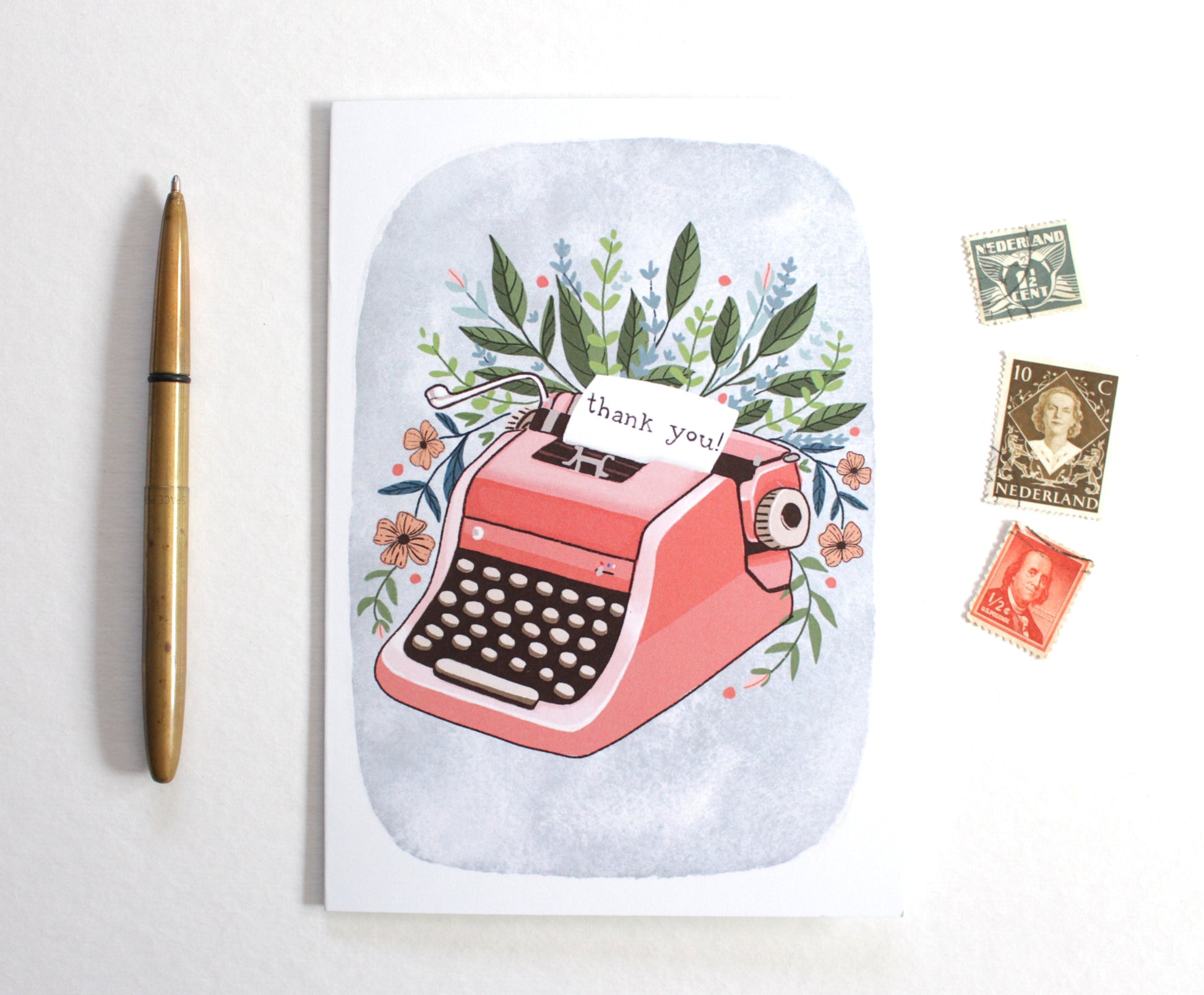 Hello! This is a blank greeting card featuring a pink typewriter with a little thank you note typed out.