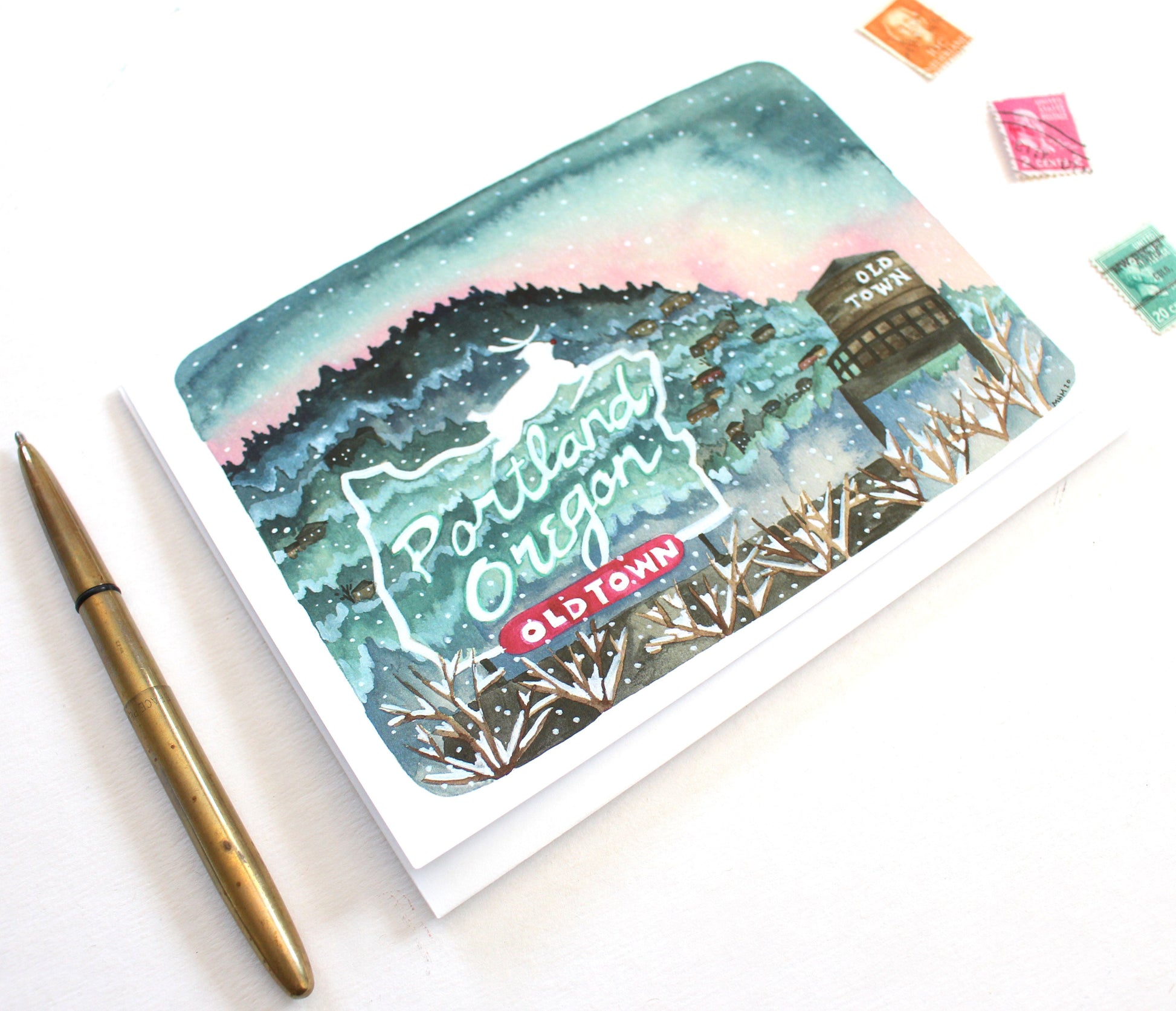 Hello! This listing is for a single blank card featuring Portland's White Stag sign in a rare snowfall.