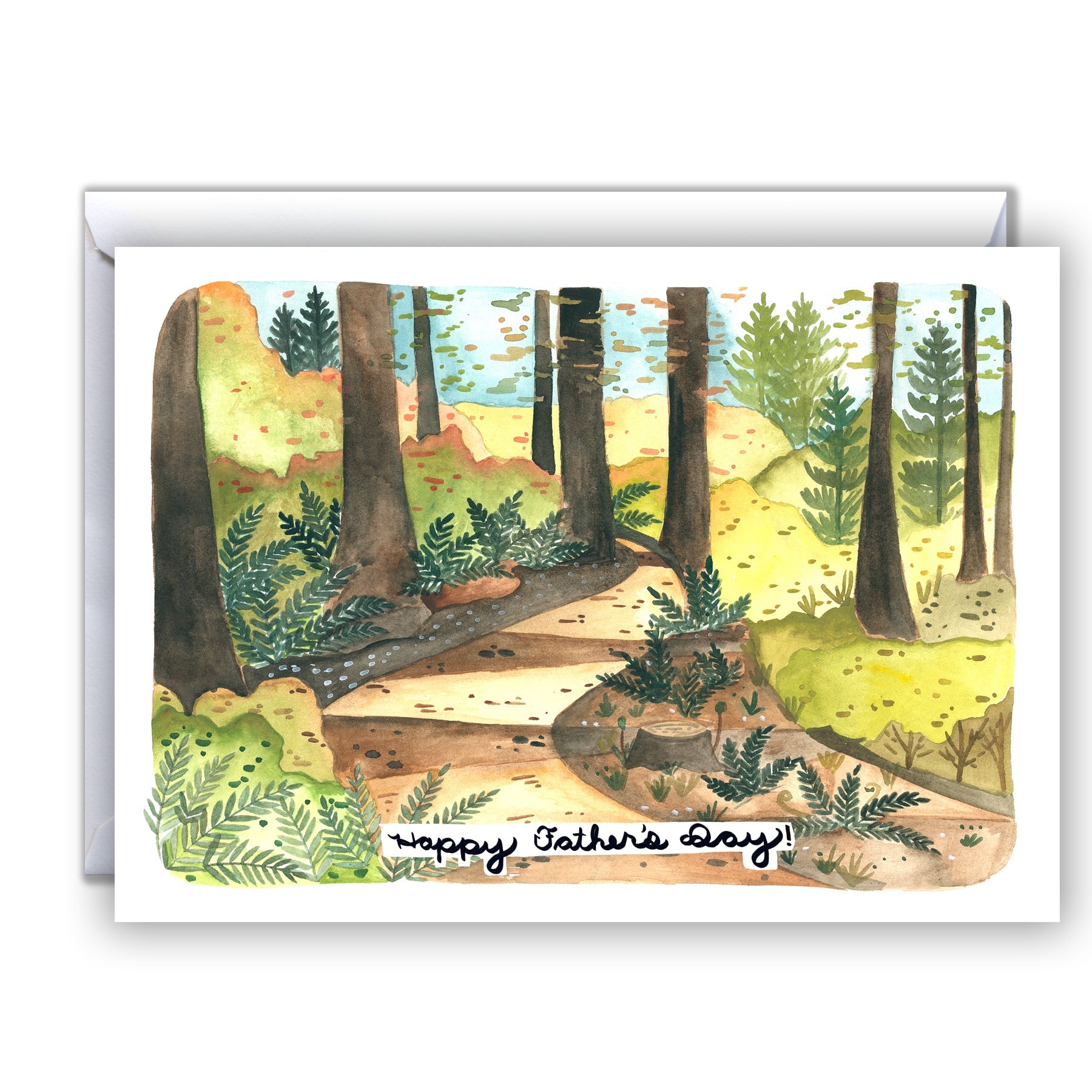 Hello! This is a listing for a blank Father's Day card featuring a lovely hiking train Forest Park.