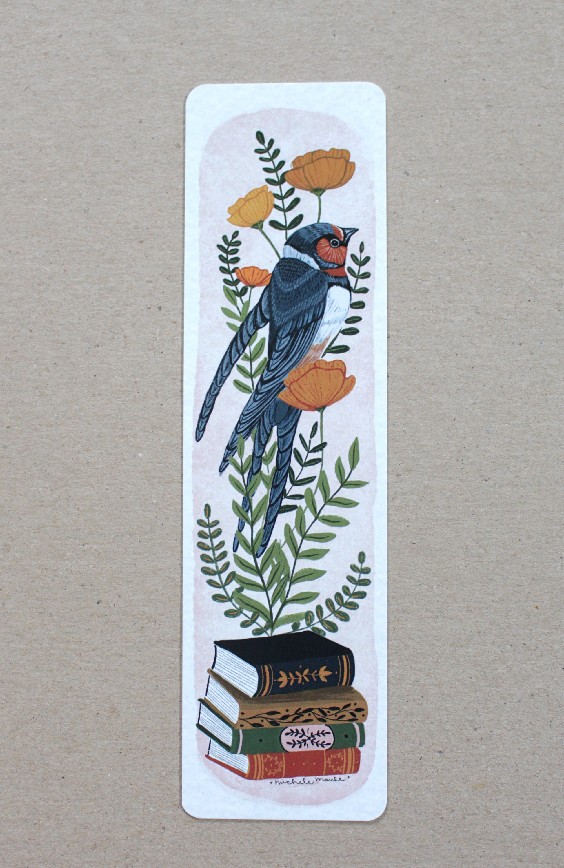 This is a illustrated bookmark featuring a beautiful swallow that's printed on both sides.