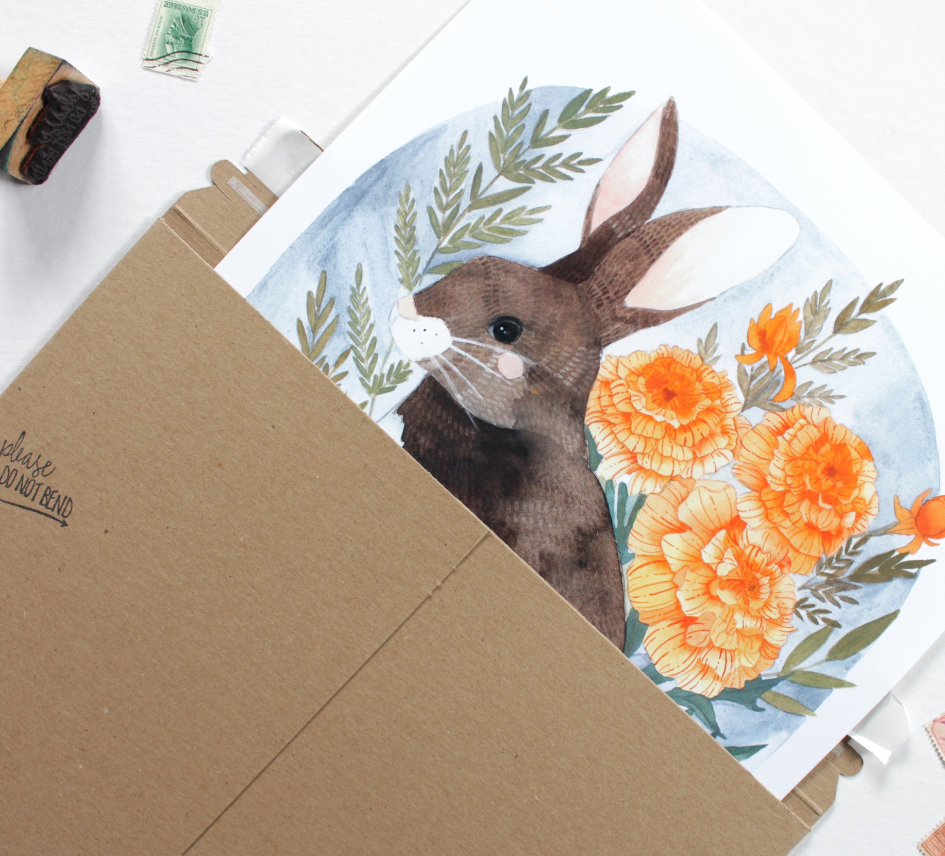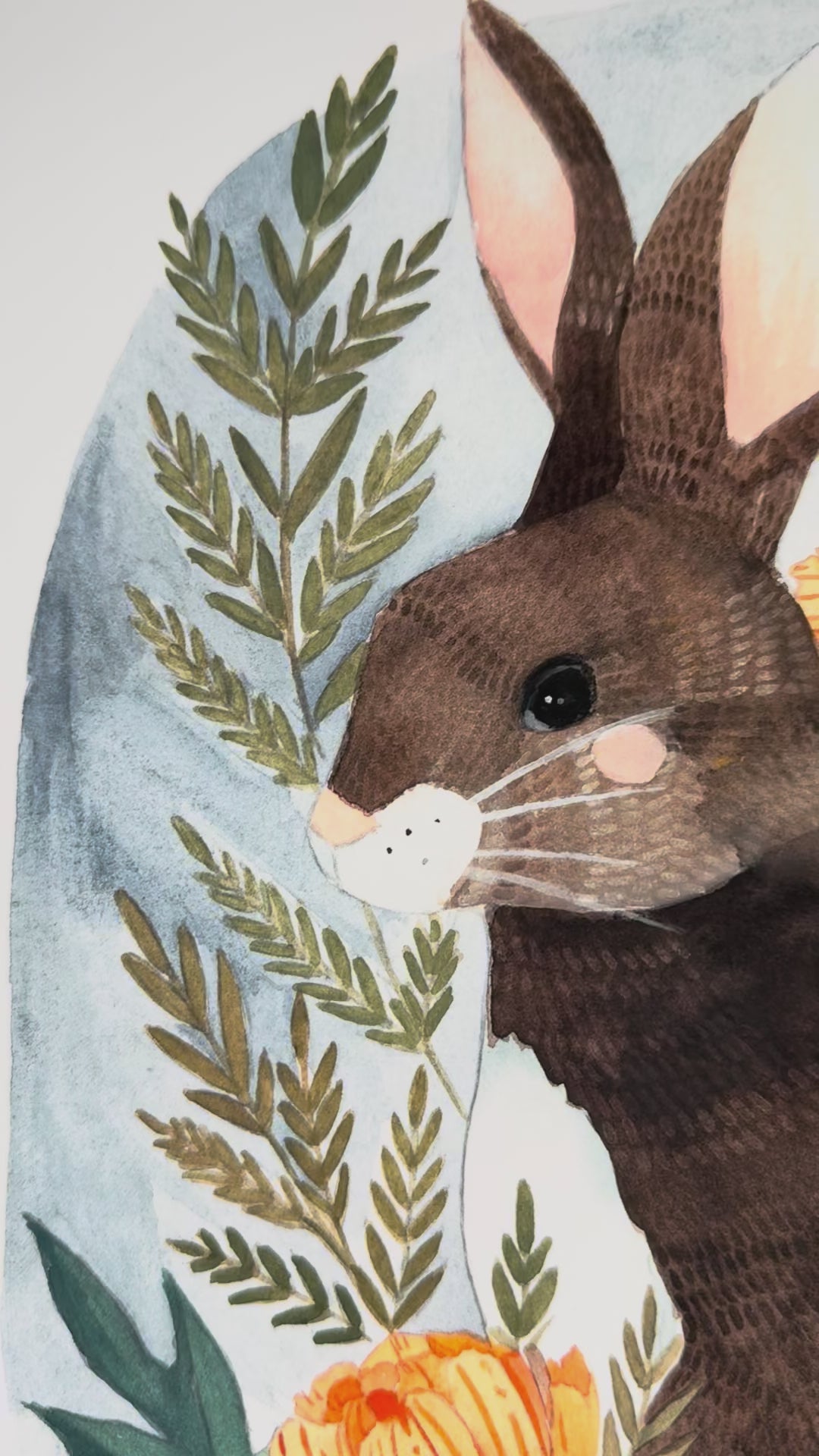 Hello! This is a listing for a print of an original illustration featuring a hand drawn illustration of a sweet bunny. I drew and painted this image myself. I then scan the painting, and have it printed on an archival, matte paper.
