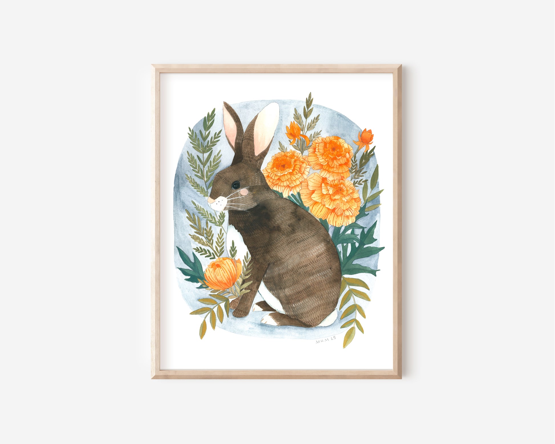 Hand Drawn Bunny Illustration with Marigold Flowers (11x14)
