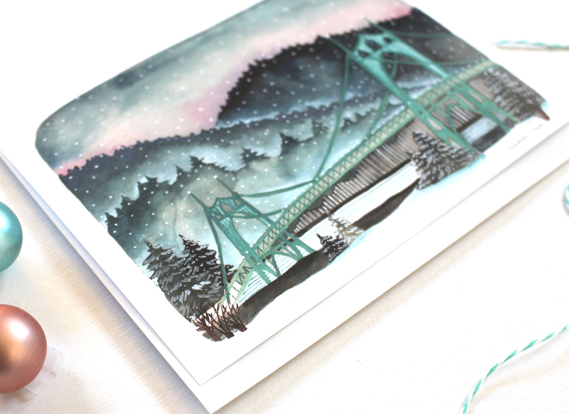 Hello! This listing is for a single blank card featuring Portland's St Johns Bridge in a rare winter snow fall.