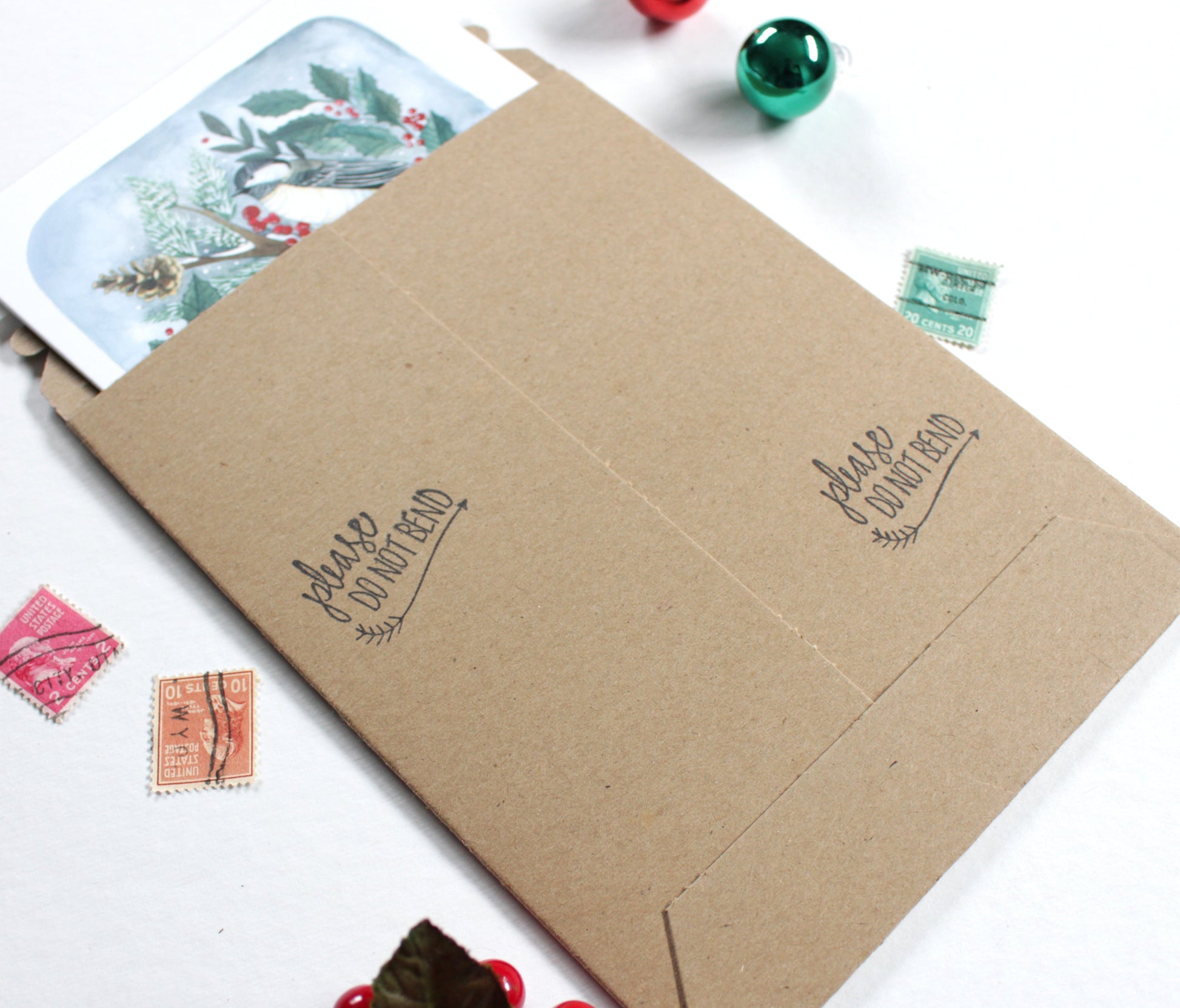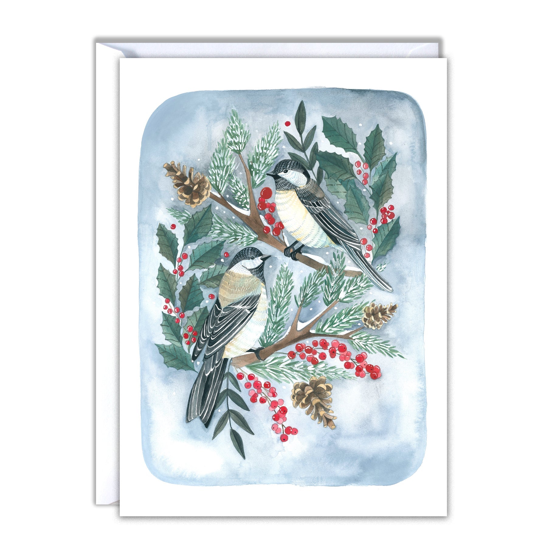 Hello! This is a winter chickadee card featuring two chickadees in a holly bush.