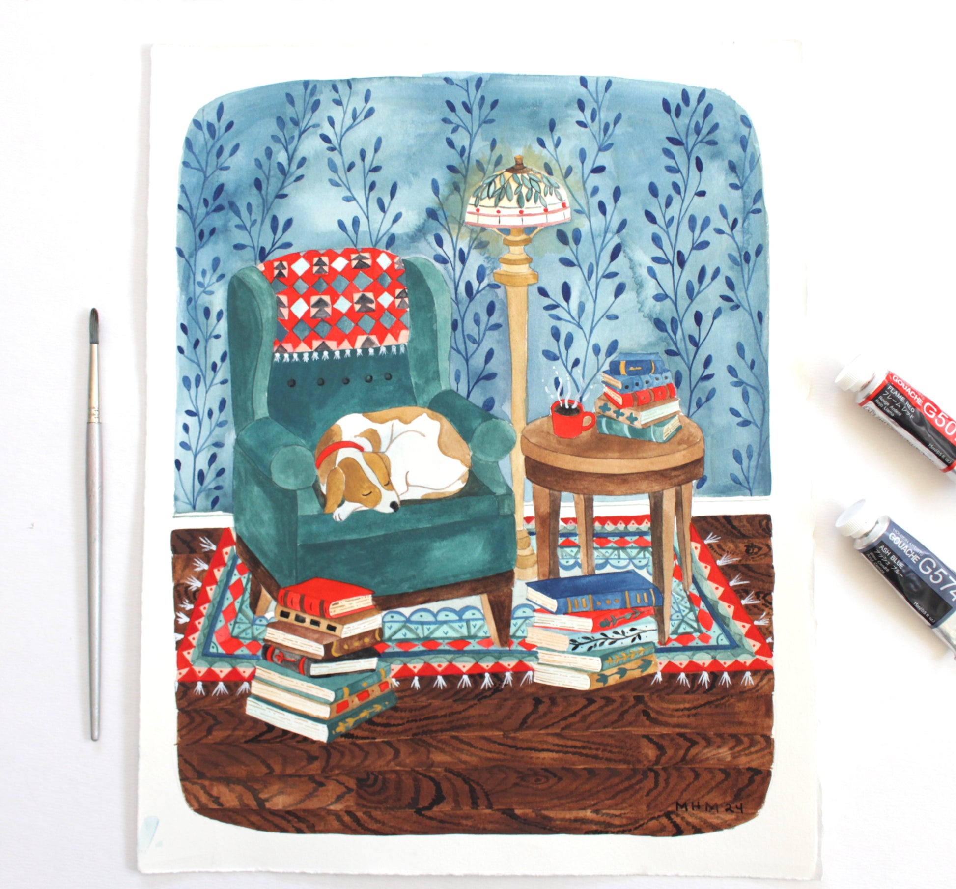 This is a listing for an original gouache painting on paper. I painted this cozy little scene of a napping dog in an oversized chair, surrounded by book and a lovely cup of tea. I love being cozy and comfortable, and I tried to achieve that feeling with this painting.