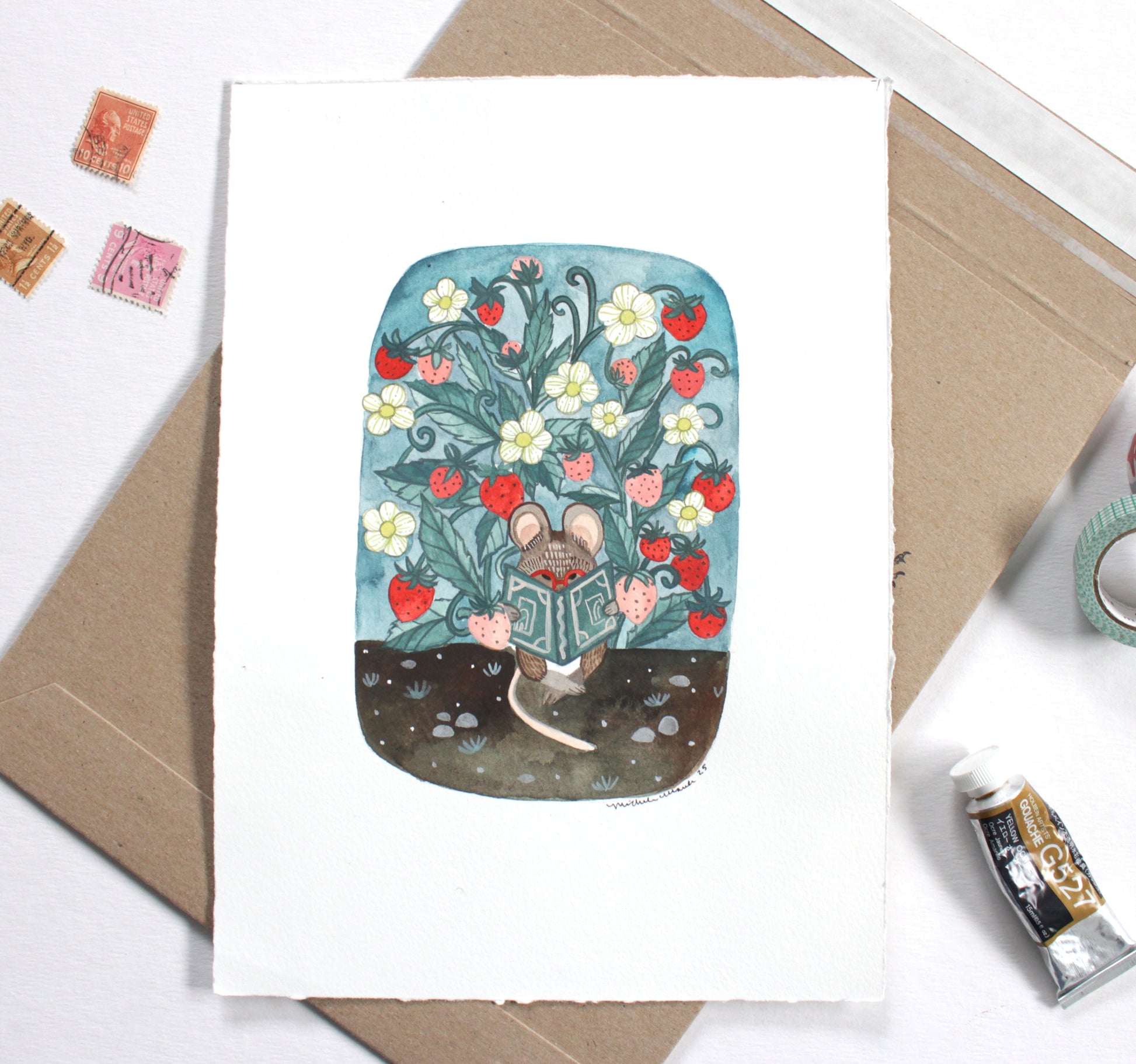This is a listing for an original painting of a sweet little mouse finding some time to read in the garden.