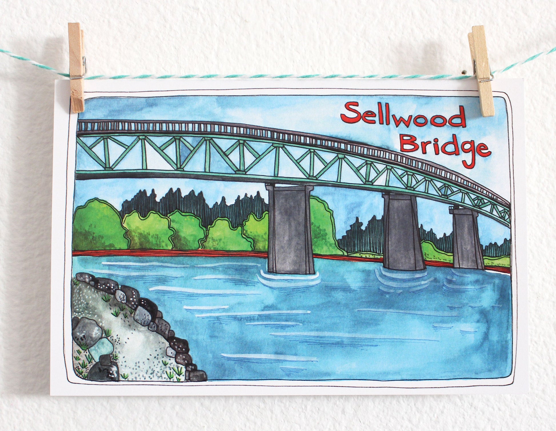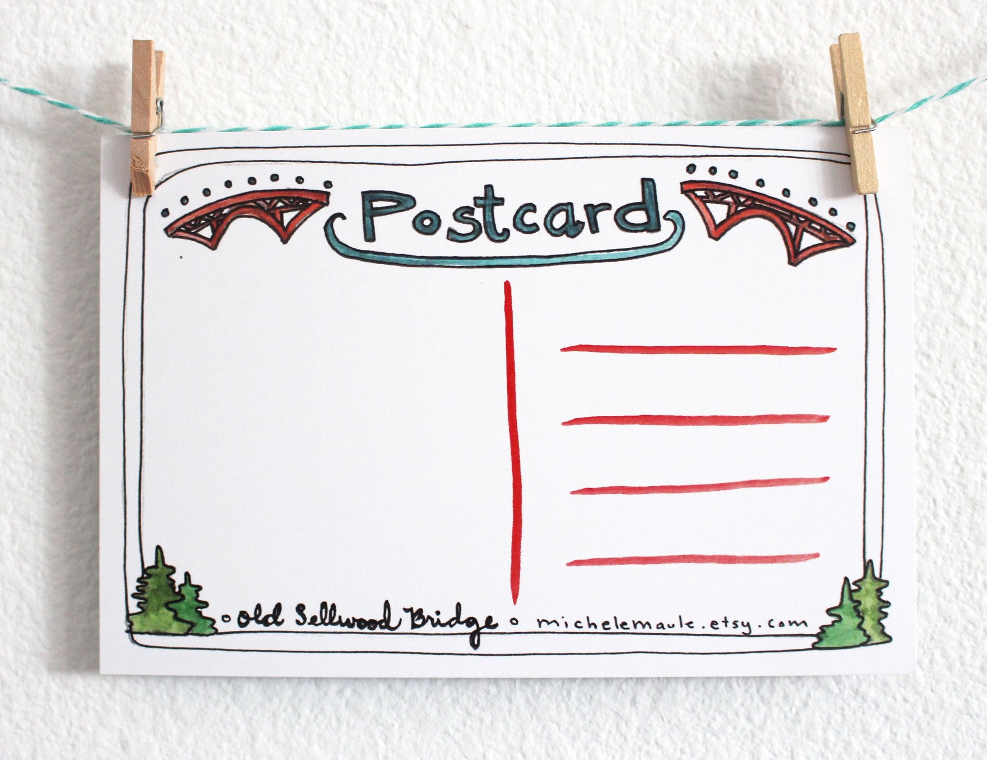 I've illustrated Portland's old Sellwood Bridge for this postcard. The back is also illustrated and there is plenty of room for a short message and the recipient's address.