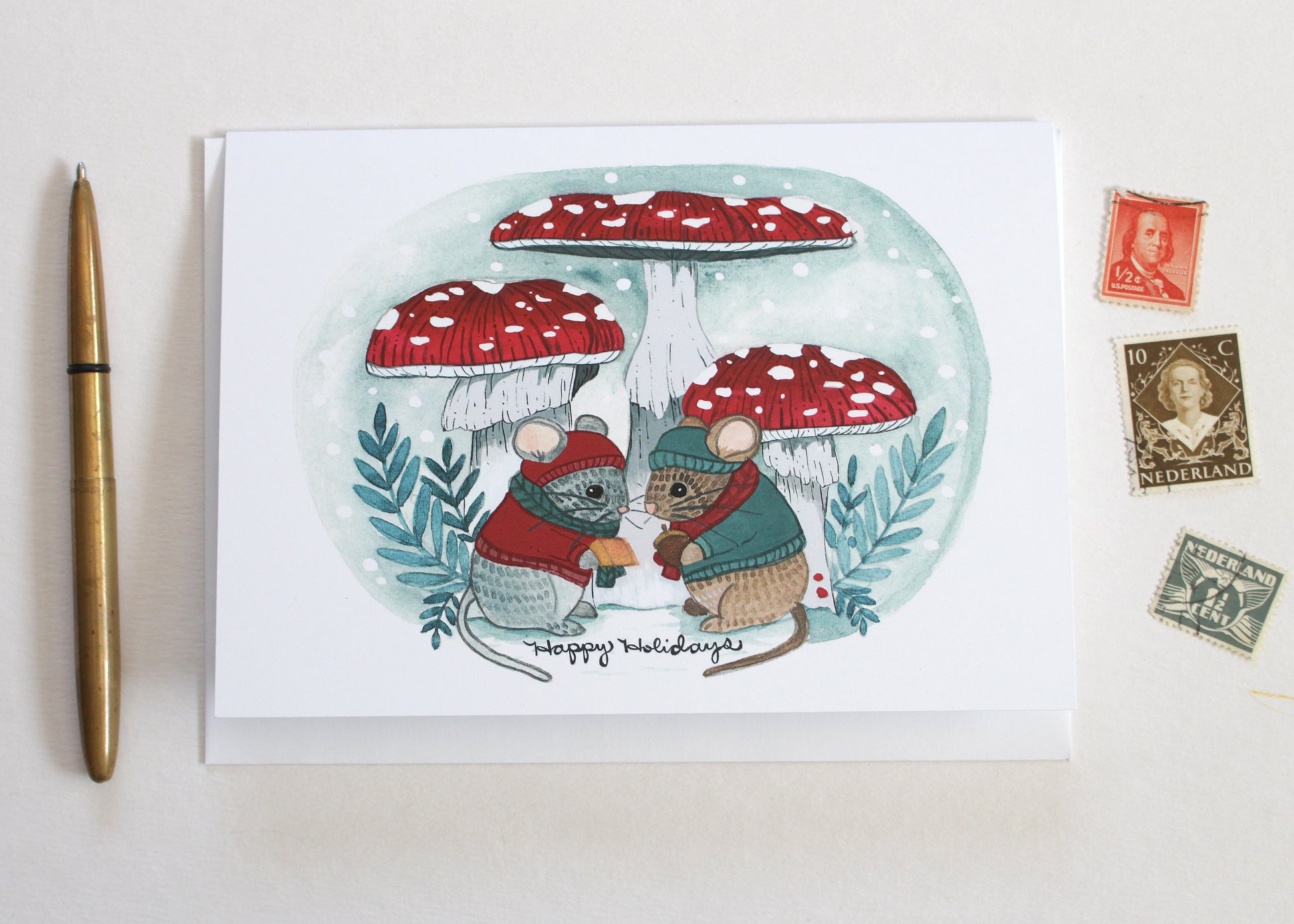 Hello! This listing is for a set of 5 holiday cards featuring a sweet mice friends.