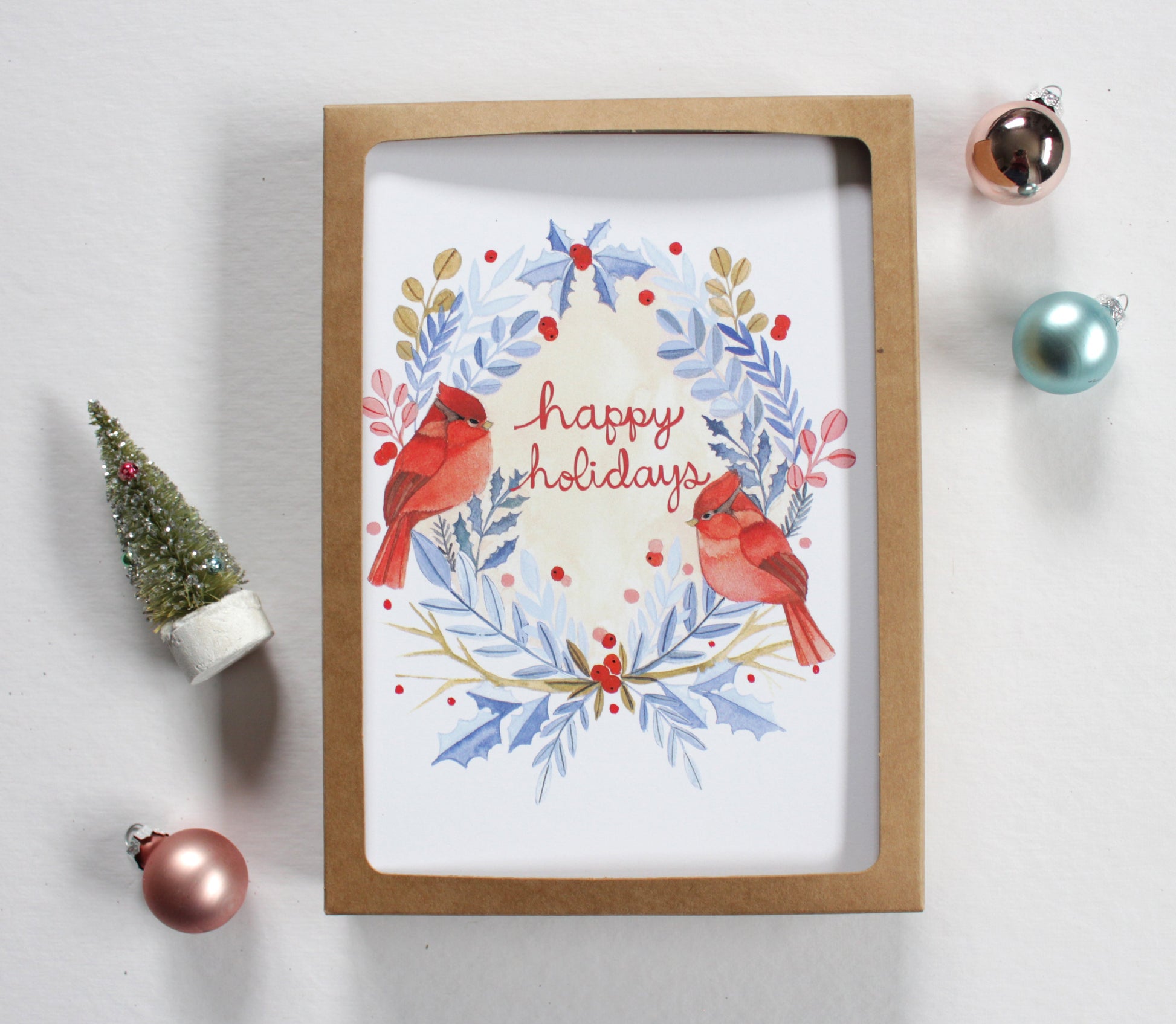 Hello! This listing is for a set of 5 holiday cards featuring two red cardinals sitting in a holiday wreath.