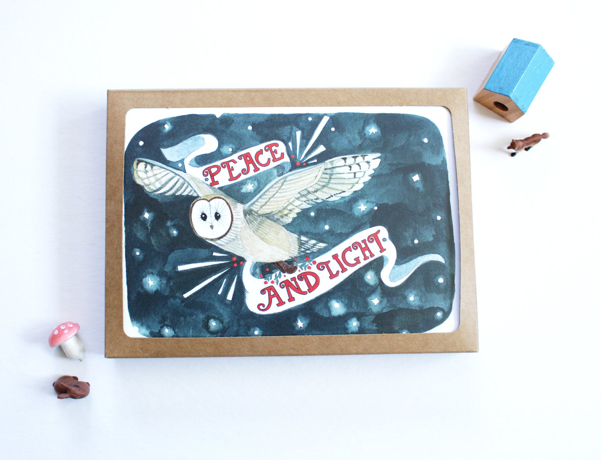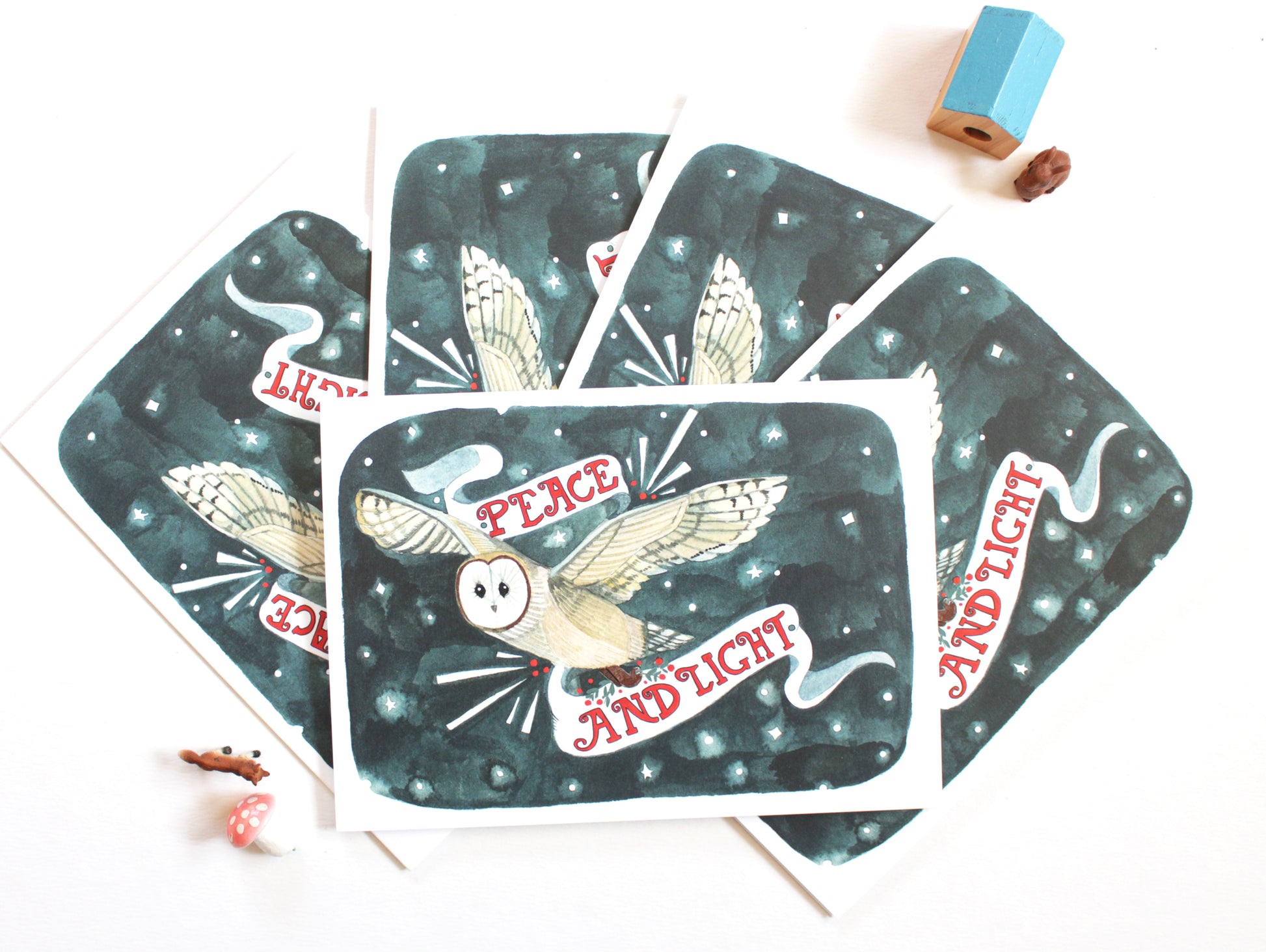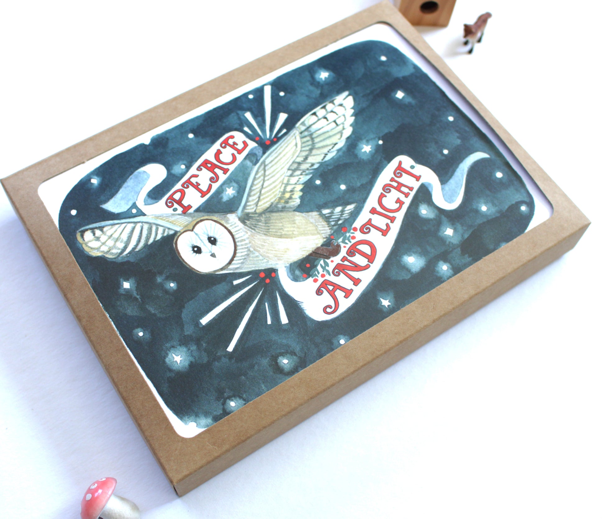 Hello! This listing is for a set of 5 holiday cards featuring a barn owl carrying a banner with the words peace and light.