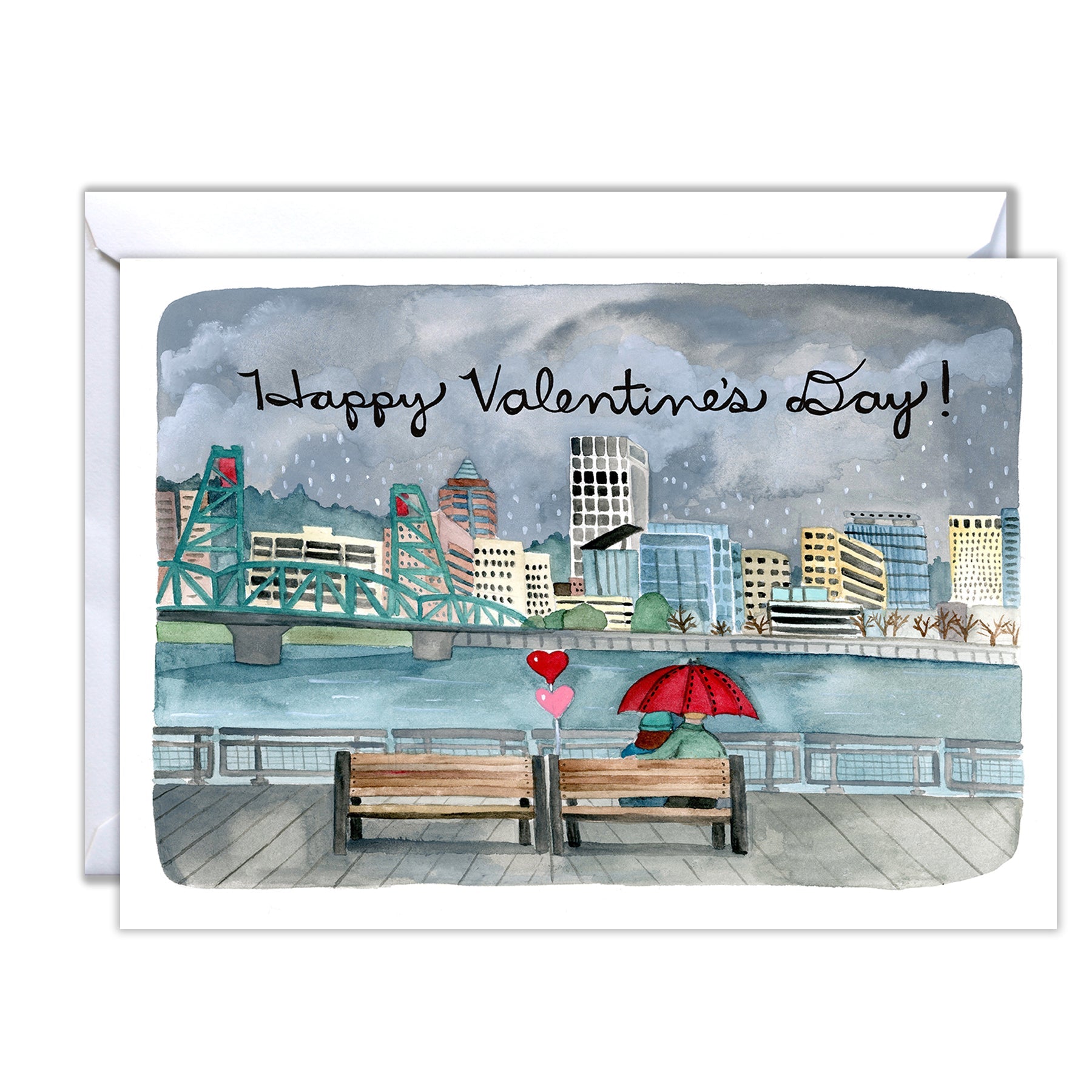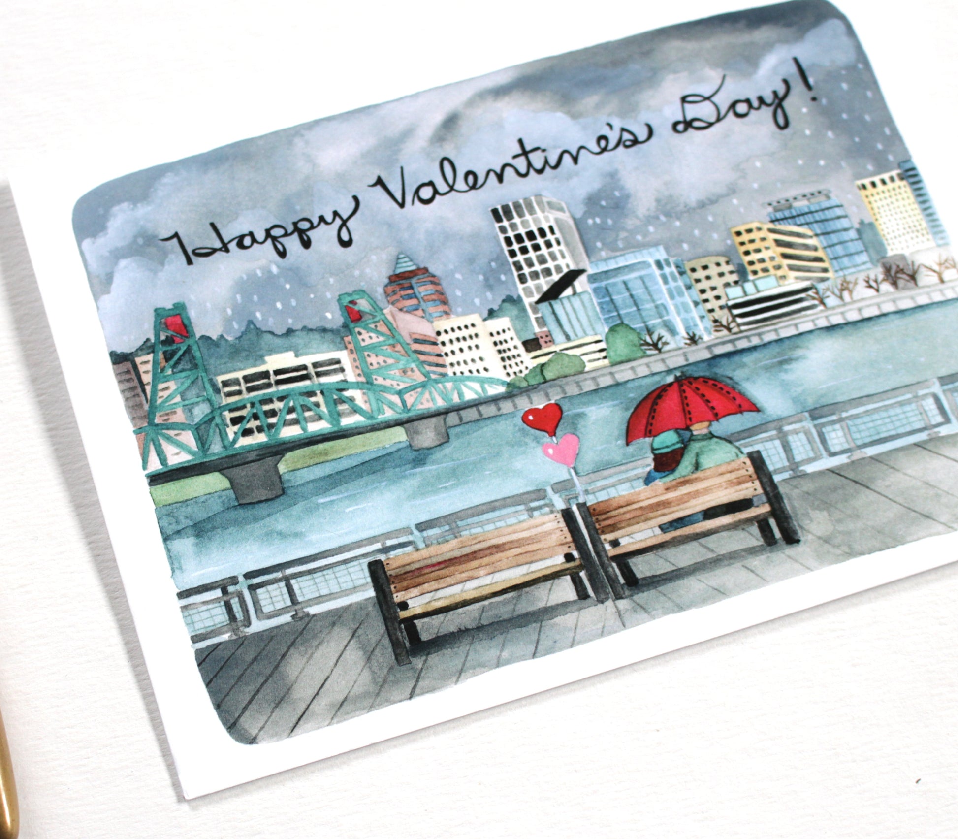 Hello! This is a listing for a blank Valentine's Day card. The city in the background is Portland, Oregon, and you can see the Hawthorne Bridge in the background.