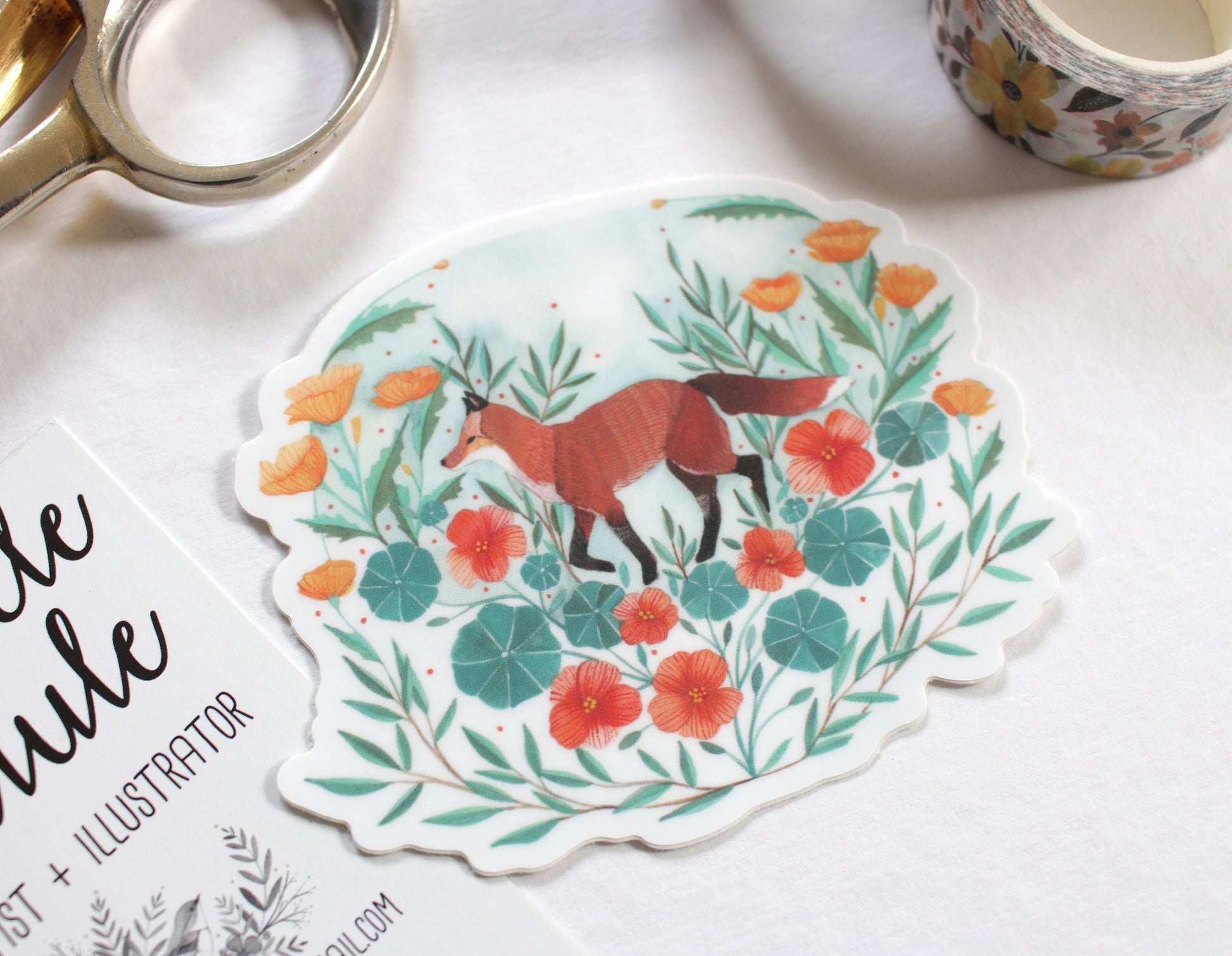Hello! This is a listing for a single sticker featuring a red fox surrounded by Nasturtium and California Poppies.