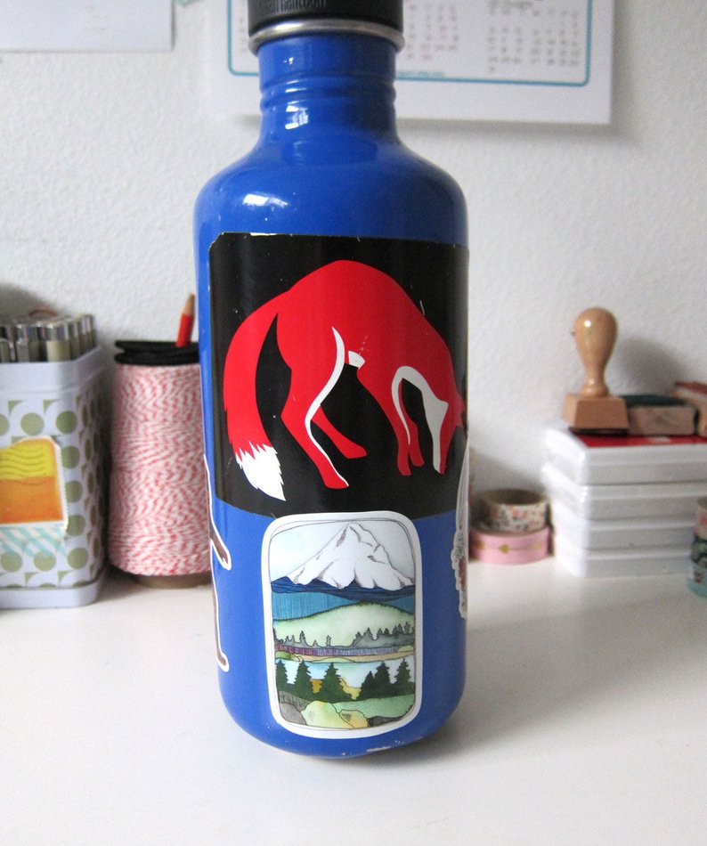 This sticker measures about 2 x 3". It is very durable, waterproof and scratch proof. They can be used on water bottles, laptops, cars and phones.